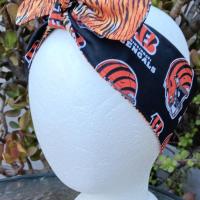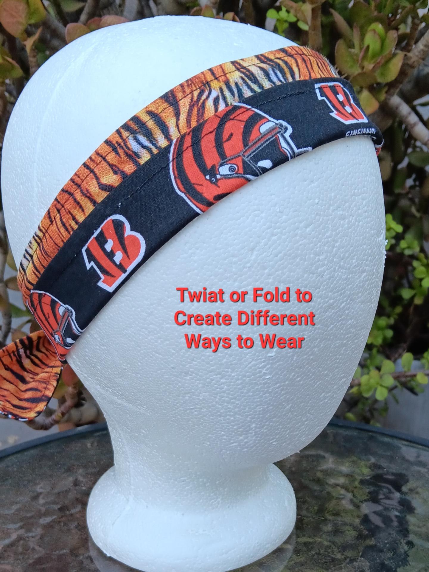 Self tie headband with licensed Cincinnati Bengals fabric on one side, and a striking digital print tiger stripe on the other. Chose orange or white tiger print. A fun and versatile way to show off your football team pride.