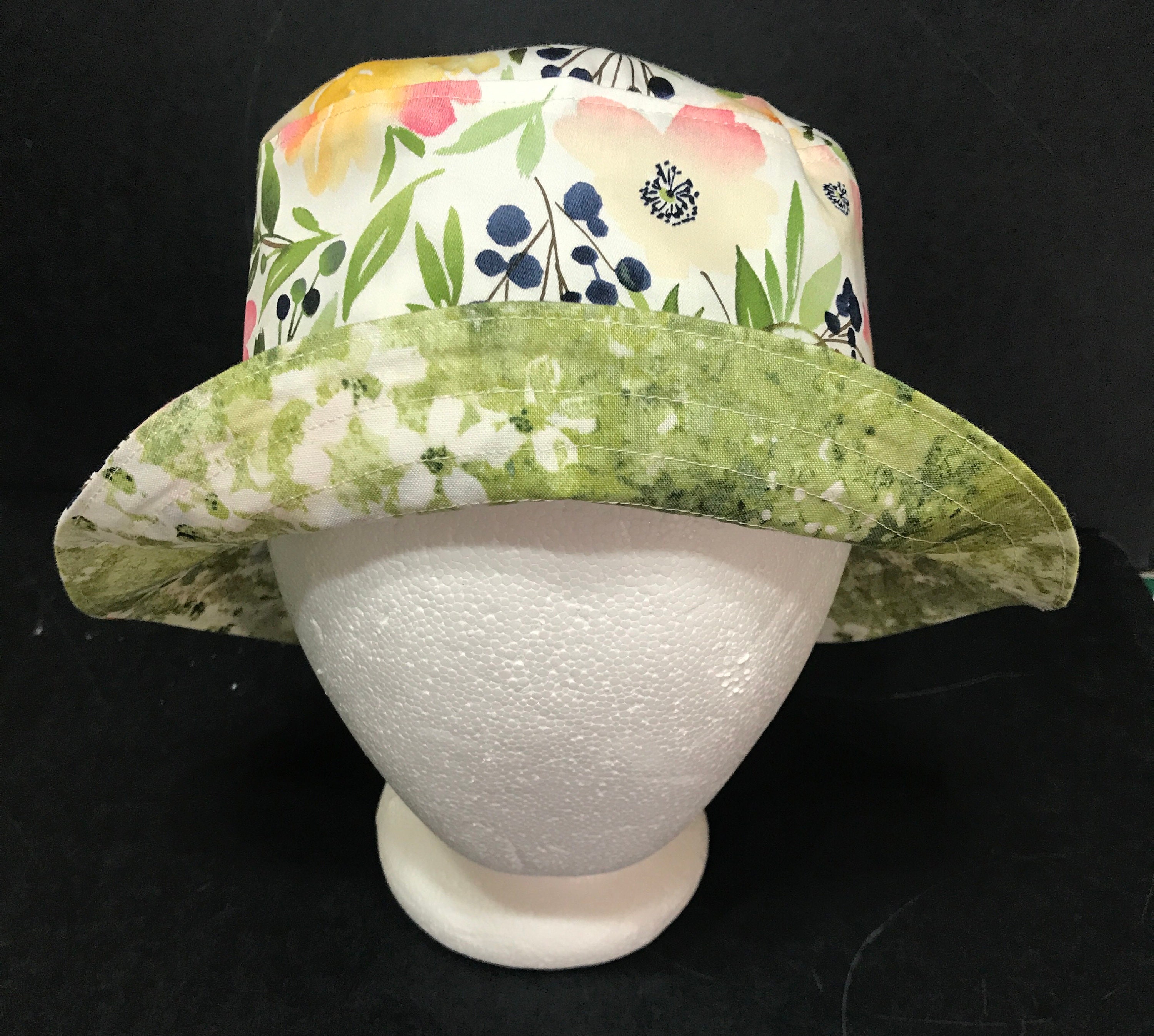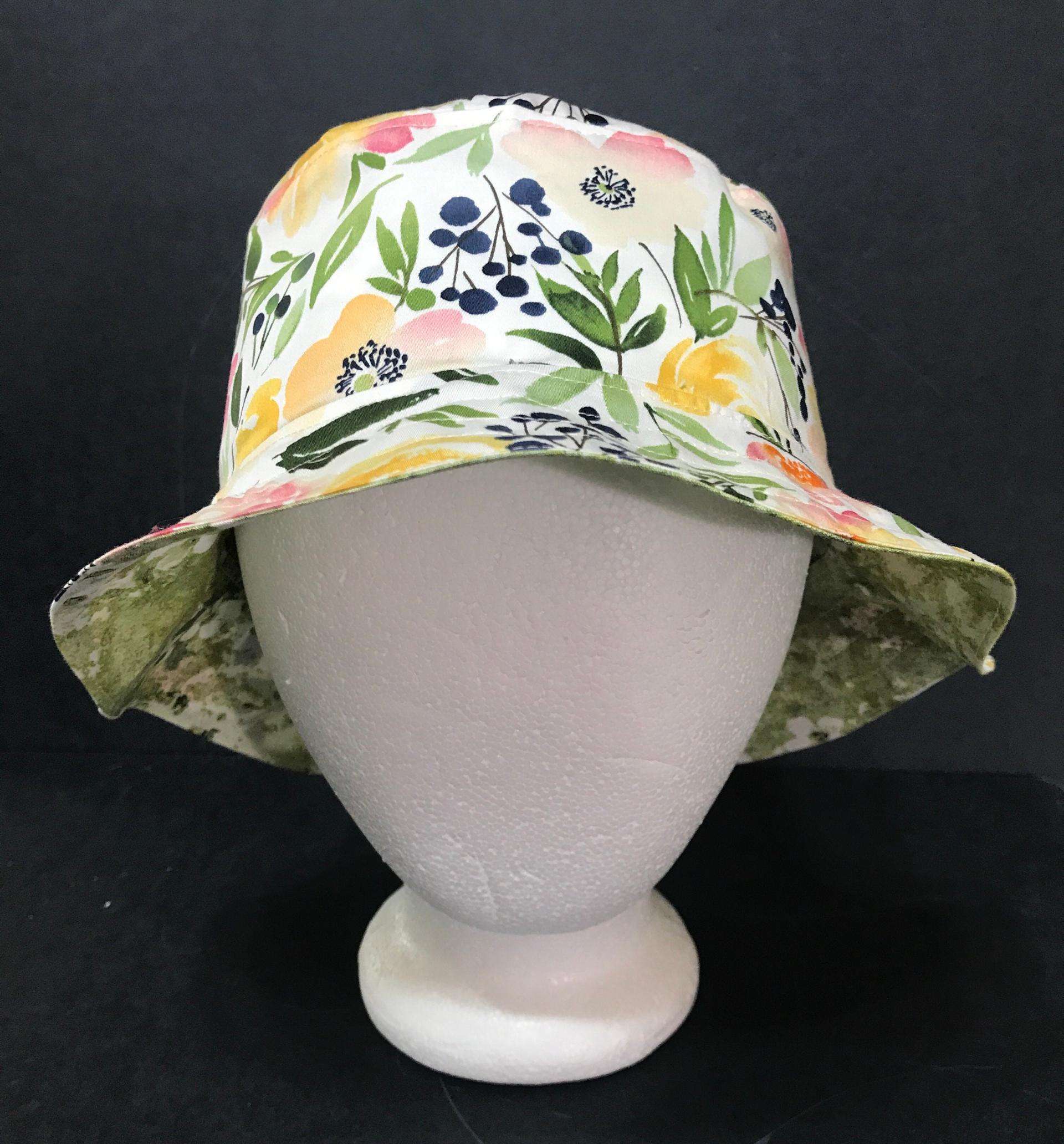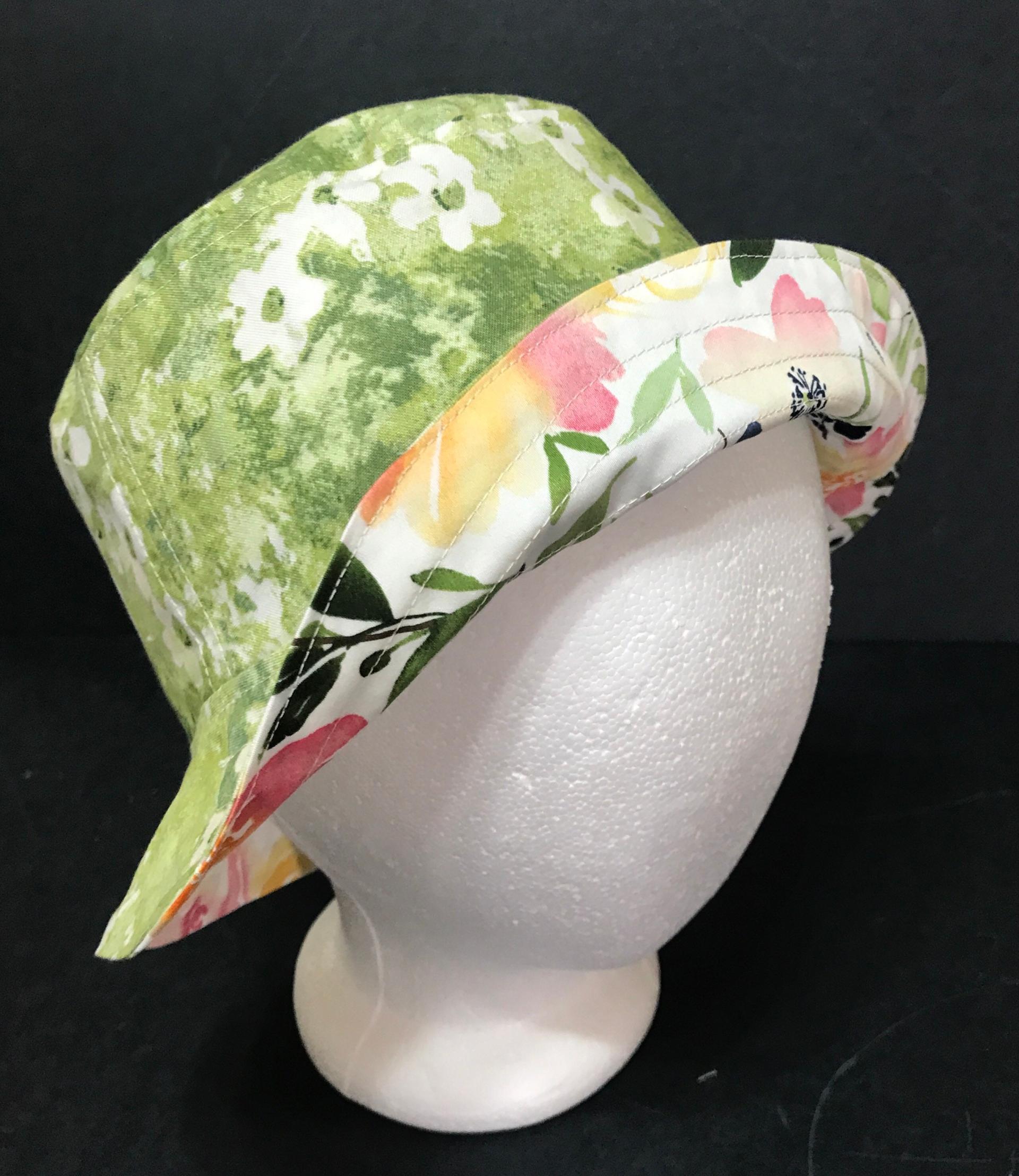 Pretty watercolor floral print bucket hat reverses to a green and white subtle floral print. Size Medium. I can imagine this at an outdoor party or a garden wedding.